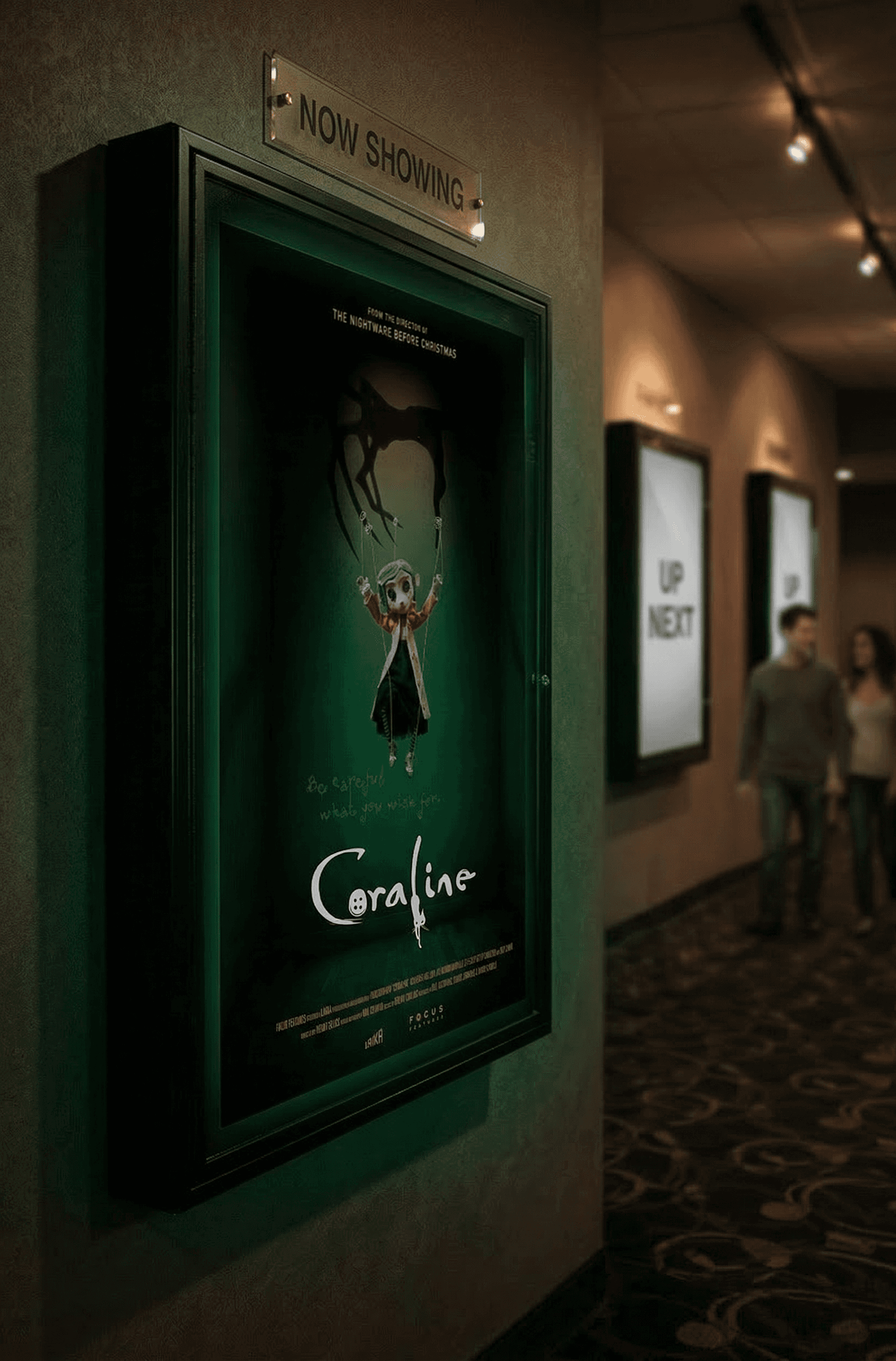In this design, I centered my concept around the themes of control and manipulation, using composition and lighting to create an eerie, unsettling atmosphere that reflects the psychological tension of Coraline. I chose to place the scene within a dark, empty room in the Pink Palace setting to ground the viewer in the film’s world while creating a sense of unsettling isolation. The Coraline doll is suspended like a puppet, visually reinforcing the idea that she is being controlled by the Beldam, whose looming hand acts as the puppet master and dominant visual force. I used a green spotlight to establish the focal point and introduce a sickly, unnatural glow that enhances the unsettling tone while guiding the viewer’s eye toward the center of the composition. Overall, my design choices emphasize vulnerability, control, and the deceptive allure that is at the heart of the film’s narrative.