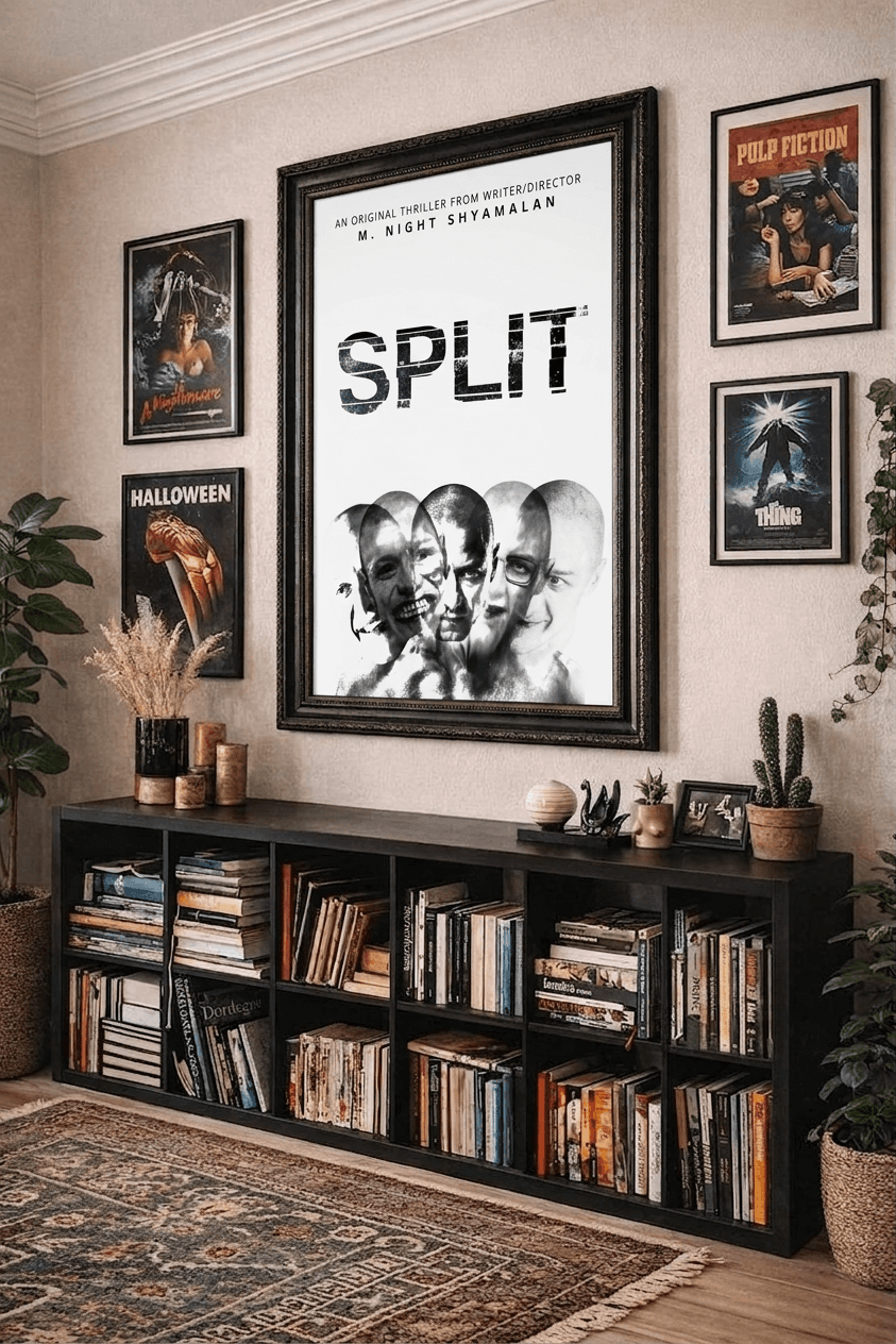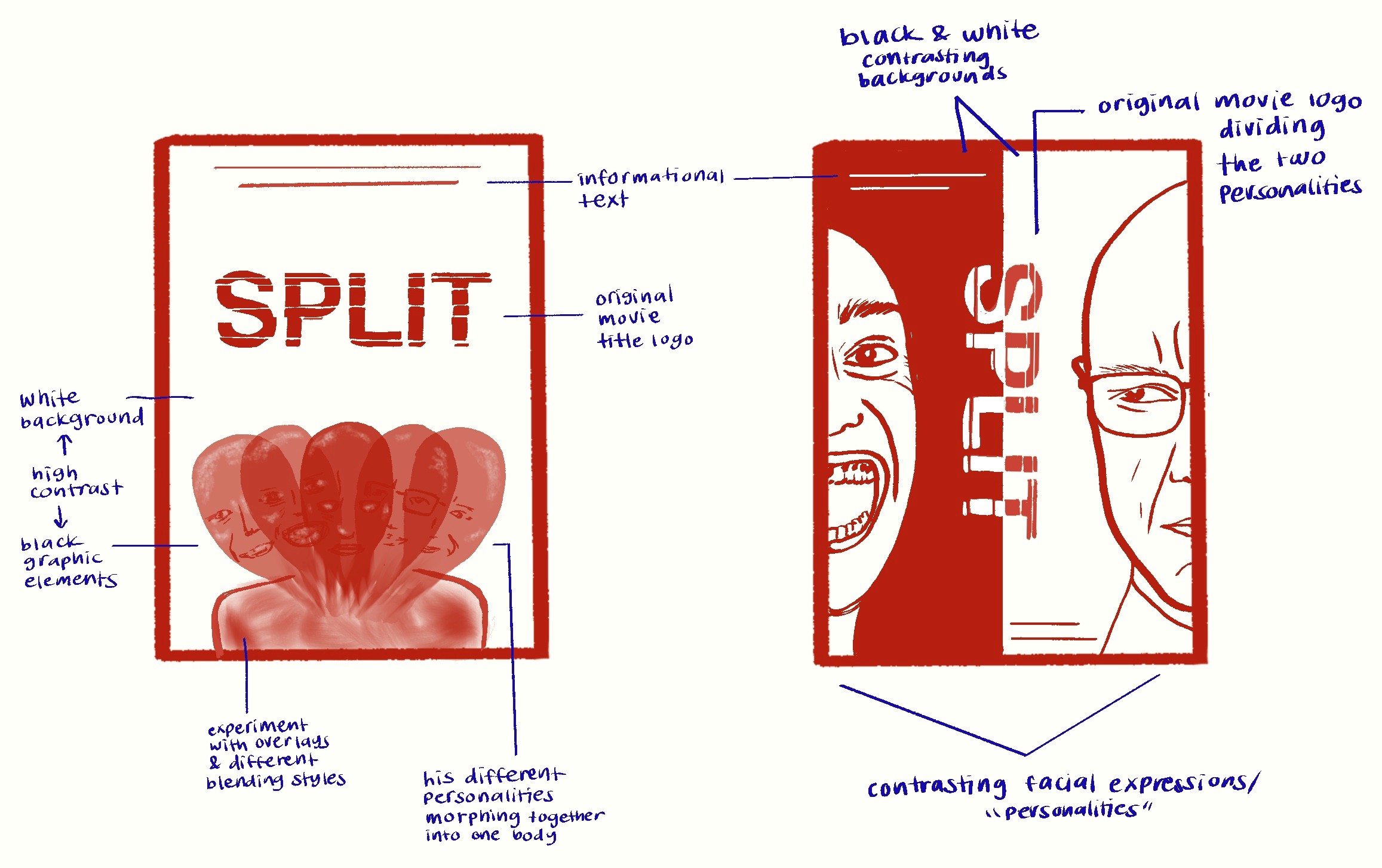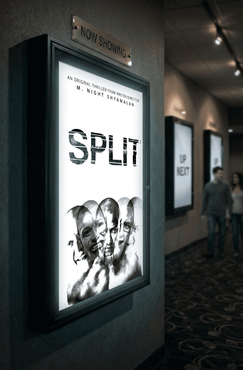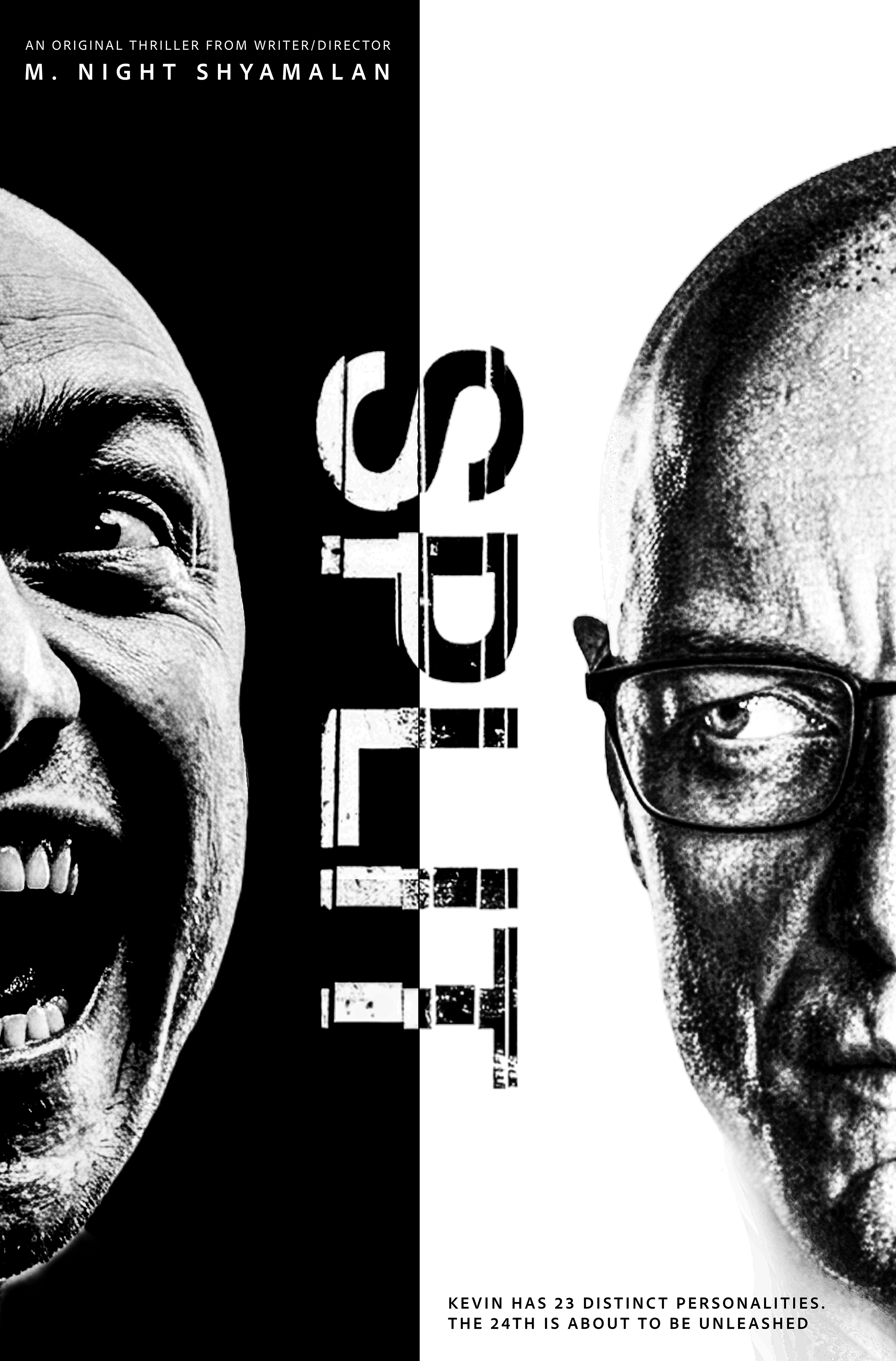 This project reimagines a poster for the psychological thriller Split, focusing on the film’s central concept of fractured identity and the coexistence of multiple personalities within a single character. My aim for this design was to visually communicate the psychological complexity and tension of the film while maintaining a minimal, clean composition that emphasizes concept over clutter. The main character’s dissociative identities are represented through overlapping facial expressions, each representing a distinct personality existing within one individual. I thought by layering the faces on top of one another, I could communicate a sense of instability, internal conflict, and the blurred boundaries between identities, which are all themes that are essential to the narrative.